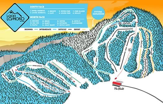 View the trails and lifts at Loch Lomond with our interactive trail map of the ski resort. Plan out your day before heading to Loch Lomond or navigate the mountain while you're at the resort with the latest Loch Lomond trail maps.