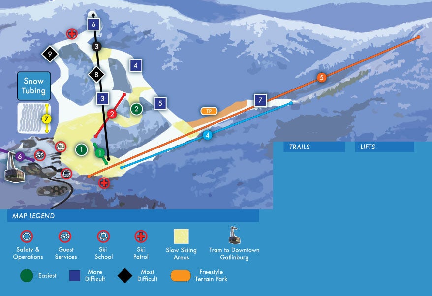 Ober Gatlinburg offers 38 skiable acres with an average snowfall of 35 inches. The top elevation is 3,300 feet with a base elevation of 2,700 feet. Total vertical drop is 500 feet. The longest run is 0.94 miles, and the total breakdown of trail difficulty is 25% beginner, 50% intermediate and 25% advanced. Besides the 10 trails, there is one terrain park. Look for the orange oval for the freestyle skiing areas. All trails are maintained with the latest technology snow-grooming equipment.